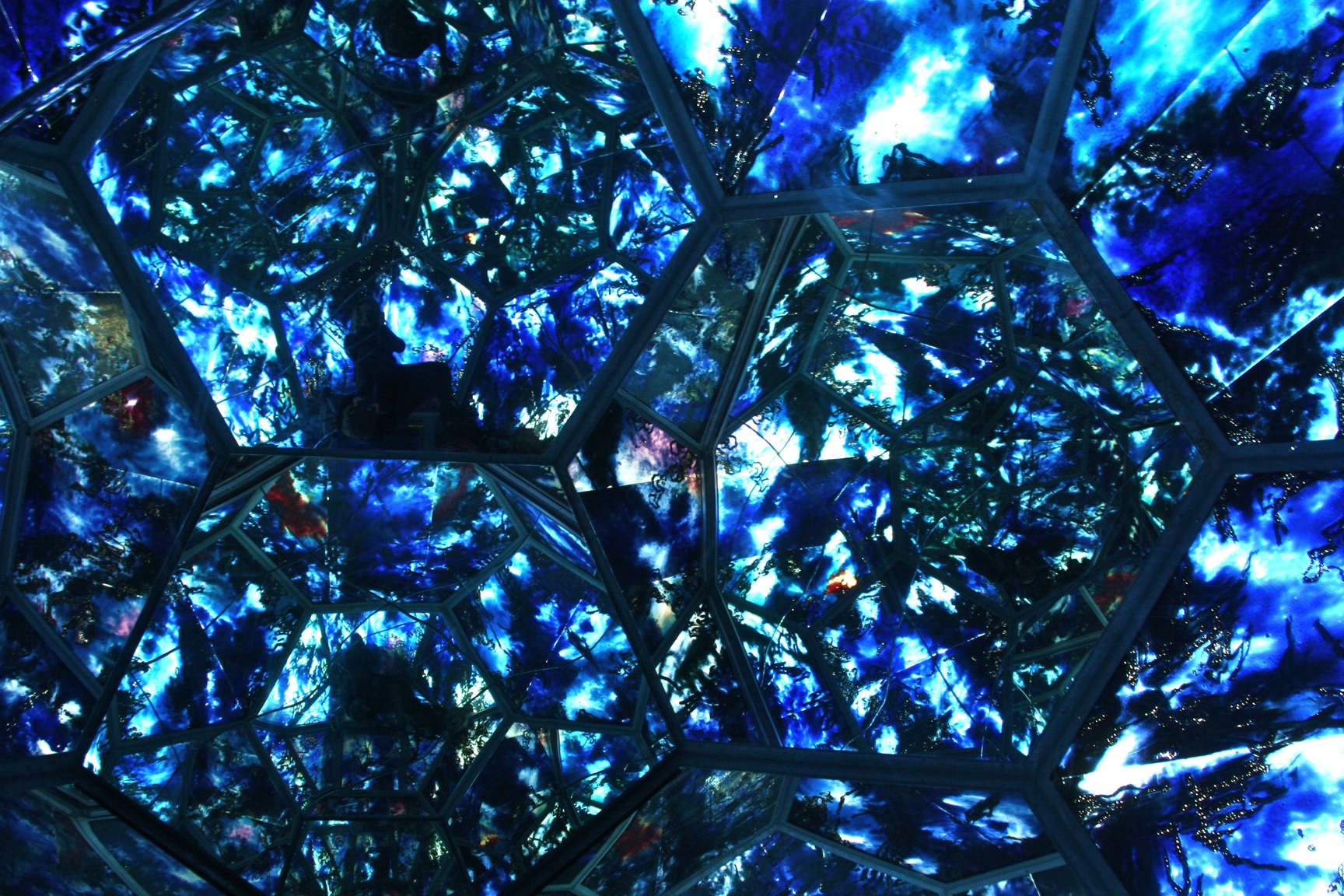 Cosmic room is a large dome, not unlike an igloo, made from coloured glass plates and mirrors shaped in geometrical shapes and mounted on a metal frame. The dome is large enough for an adult to stand upright when inside it.